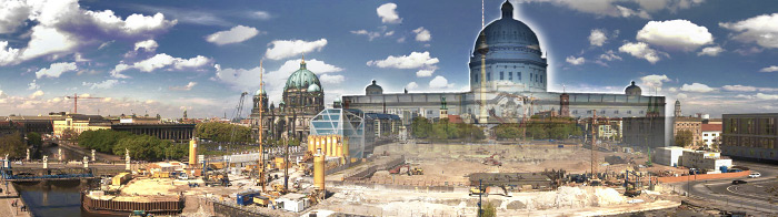 April 2012: In the center of Berlin the reconstruction of the Stadtschloss (Berlin City Palais) has begun. First steps are the preparation of the construction site and safeguarding the archeological excavations. Start of the construction activity will be in the spring of 2013. Cityscope documents the progress on the area with panoramic images, shot in an hourly schedule. |